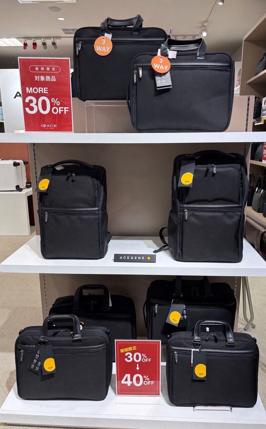 從4月24日(星期五)至5月6日(星期三/假日),ACE GENE 商務包「EVL-3.5d」在通常 30% 的折扣基礎上,額外享受 30% 的折扣。