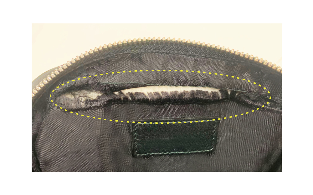 如圖所示,如果包內布料出現撕裂等易受力磨損的區域,磨損會蔓延,導致包包本身撕裂或損壞。