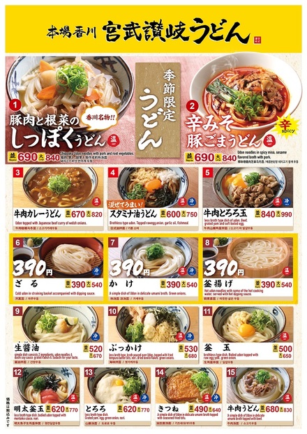 我們與位於香川縣丸龜市的歷史悠久的麵條製造商宮武Miyatake Sanukiseimenjyo合作,使用該麵廠的麵團在店內製作麵條。我們供應正宗的讚岐烏龍麵,麵條在特製的大鍋中煮製,湯底是用瀨戶內海的干沙丁魚和海帶熬製而成,味道鮮美。