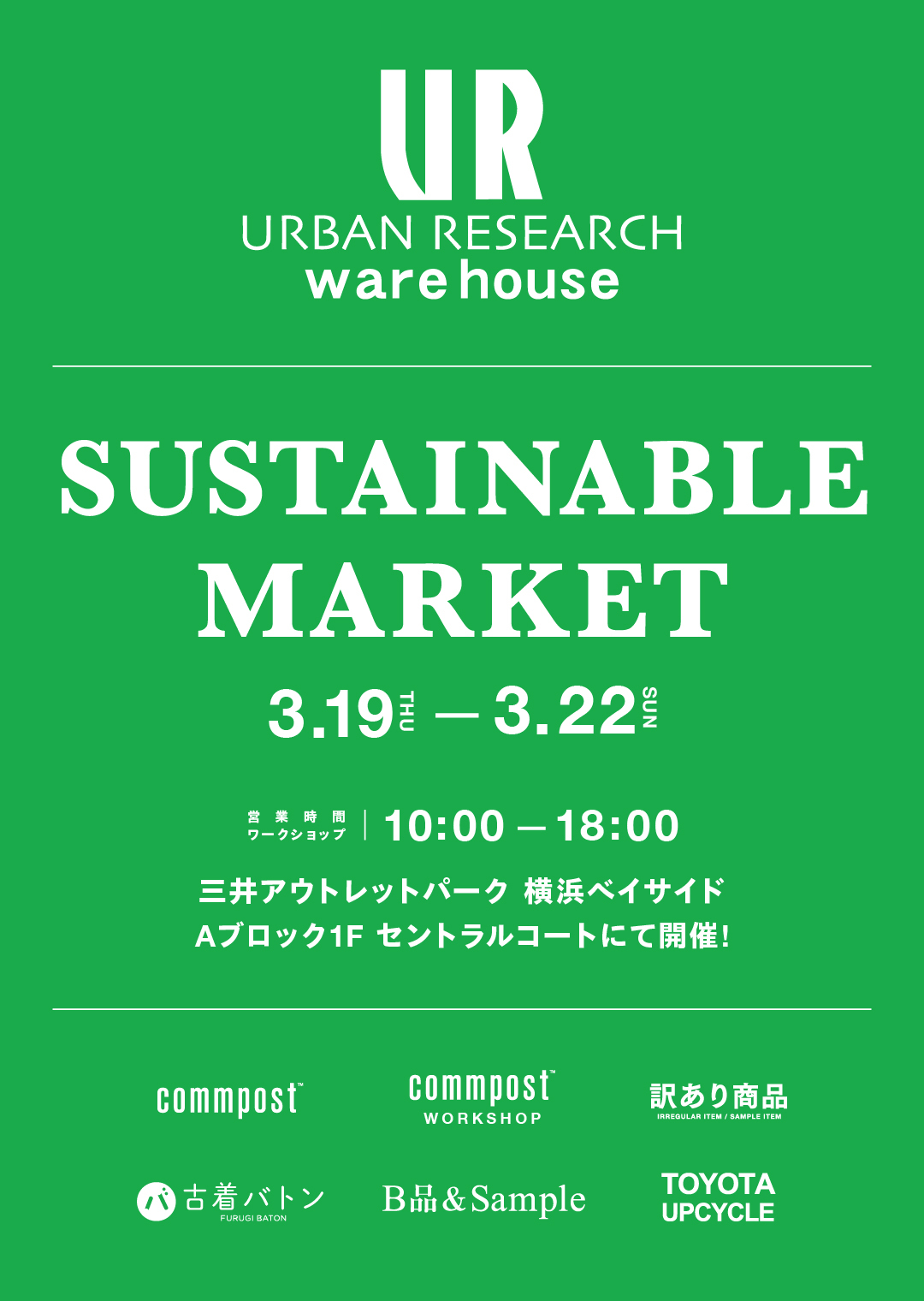 從 3 月 19 日(星期四)至 3 月 22 日(星期日),URBAN RESEARCH warehouse將在橫濱海灣MITSUI OUTLET PARK A 座 1 樓中央廣場舉辦「永續MAR」活動。