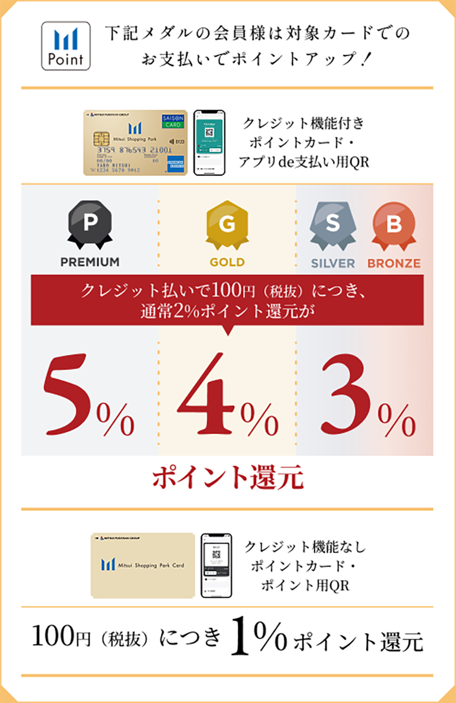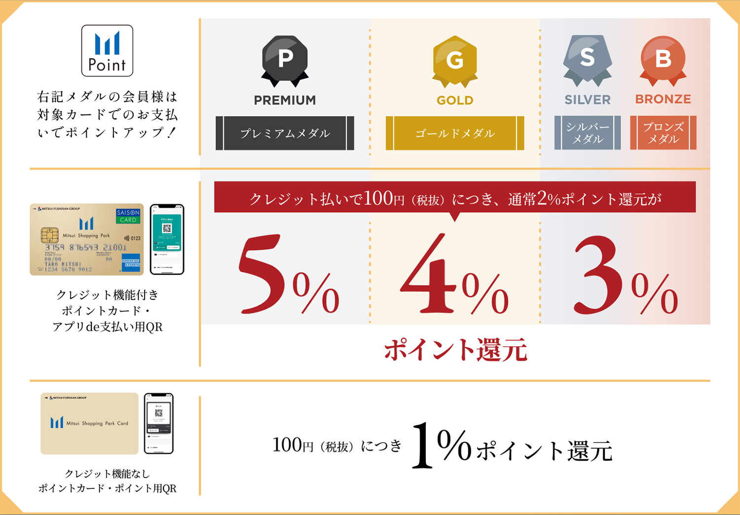 ※使用帶信用卡功能的積分卡進行信用卡支付時,每100日元 (不含稅) 可獲得“高級獎牌”4積分、“金牌獎牌”3積分、“銀牌獎牌”2積分。