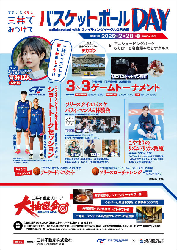 2月28日星期六,戶外活動場地Decagon將舉辦「在三井籃球日與名古屋鬥鷹隊合作尋找你的家和生活方式」活動。