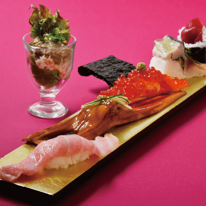 美登利の名物、極上大トロ、元祖穴子一本付け、びっくりすじこ、大名さば、おやっさんの鉄火巻き、かにみそサラダをいっぺんに味わえる、まさに「名物パレード」!お寿司との相性抜群の純米吟醸酒がついつい進んでしまいます!