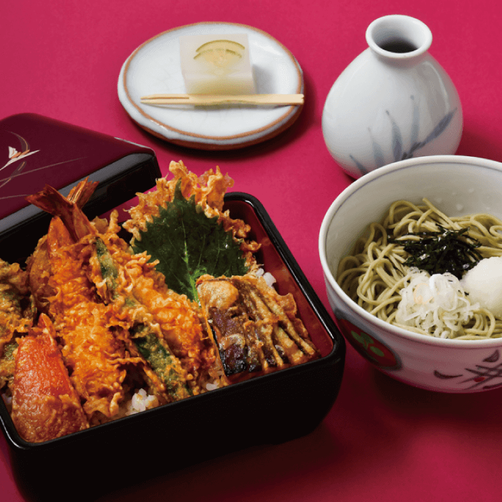 藪蕎麦伝統のメニュー復活!創業時大好評だった「天重」を当時の作り方で再現。天ぷら鍋にたっぷりの淡口ごま油のみで揚げた、力強い天ぷら(海老と旬野菜)を、やぶそば特製の丼タレにくぐらせ、重箱に丁寧に盛り付けた逸品です。