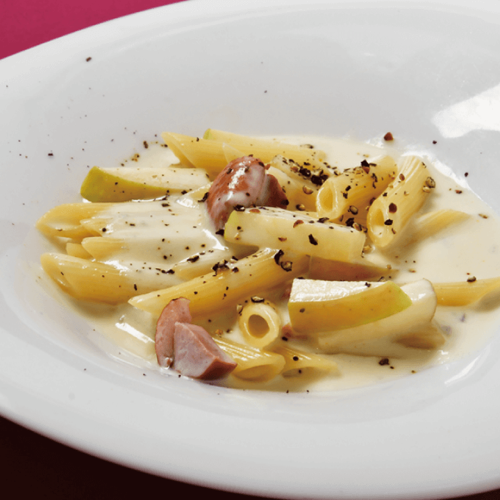 ゴルゴンゾーラの濃厚なコクをクリーミーなソースに仕立て、スモークした鴨肉の旨みと爽やかな甘みのリンゴをアクセントに加えたペンネです。濃厚かつフルーティーなペンネを、ワインと一緒にどうぞ!提供時間/全日 17:00〜L.O.21:00
