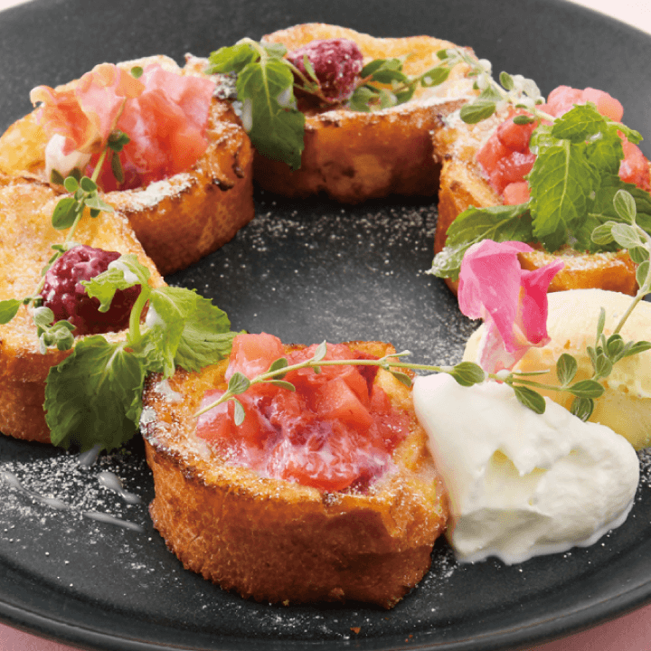 終わりのない幸せを意味する花かんむりをイメージしたおすすめのフレンチトースト。人気のフレンチトーストに、旬のフルーツとフレッシュハーブをあしらった、華やかで目にも美味しい一皿です。提供時間/平日 14:00〜、土日祝 終日
