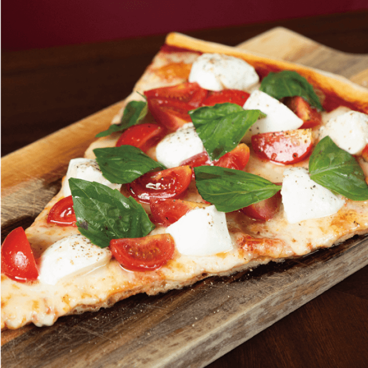 ボッコンチーノ(ひと口サイズのモッツァレッラチーズ)とフレッシュトマトの相性が抜群のスライスピッツア。さっぱりとしたトマトの酸味とクリーミーなチーズのコクが一体となった一枚です。アペロールの爽やかな味わいが合う!