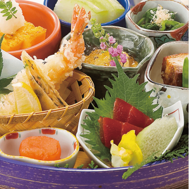 季節のお造りや揚げ物、豆皿料理、おばんざい、煮物、デザートなど、一度に色々な料理が楽しめます!彩り豊かな人気の御膳です。「雪ほたか」を使用したまろやかな旨みの日本酒と一緒に、ゆったりと楽しんで。
