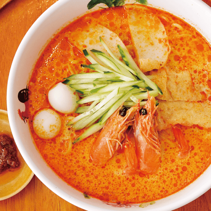 ココナッツミルクの甘さ、スパイスが効いたちょっと辛めのスープ。海老の風味が濃厚に香る辛みそサンバルブラチャをお好みで混ぜて!クセになる美味しさです!ヌードルかビーフン、お好みの麺を選べます。