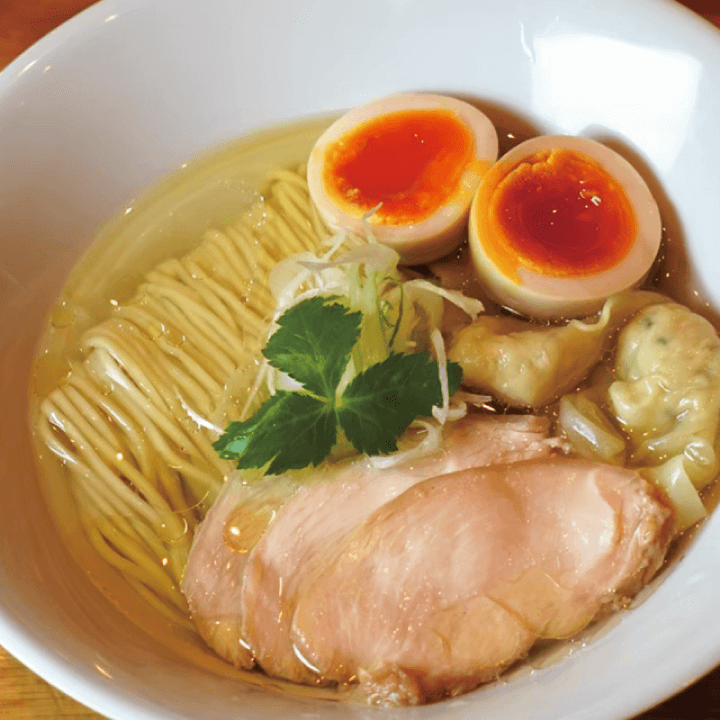 厳選した塩と白醤油と数種類のエッセンスで作った塩のスープが人気!チャーシュー・味玉・ワンタンと、フルトッピングが味わえます。全てにこだわった、自慢の一品です。迷った方はぜひ!