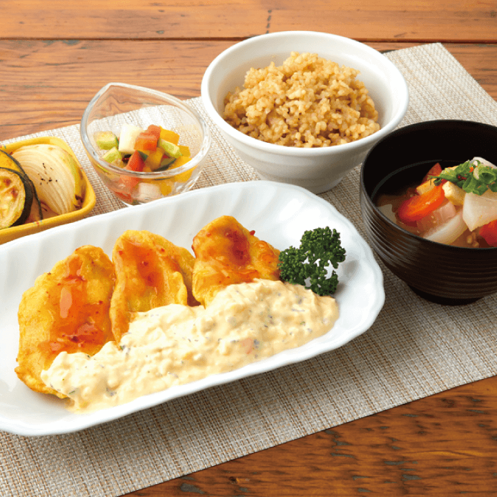 ジューシーなチキンにタルタルソースをたっぷり絡めて。「ステアリン酸」が酵素やホルモンの働きを補い、免疫力をアップ!負けないカラダ作りにおすすめの定食!管理栄養士監修のコンセプトメニューです。