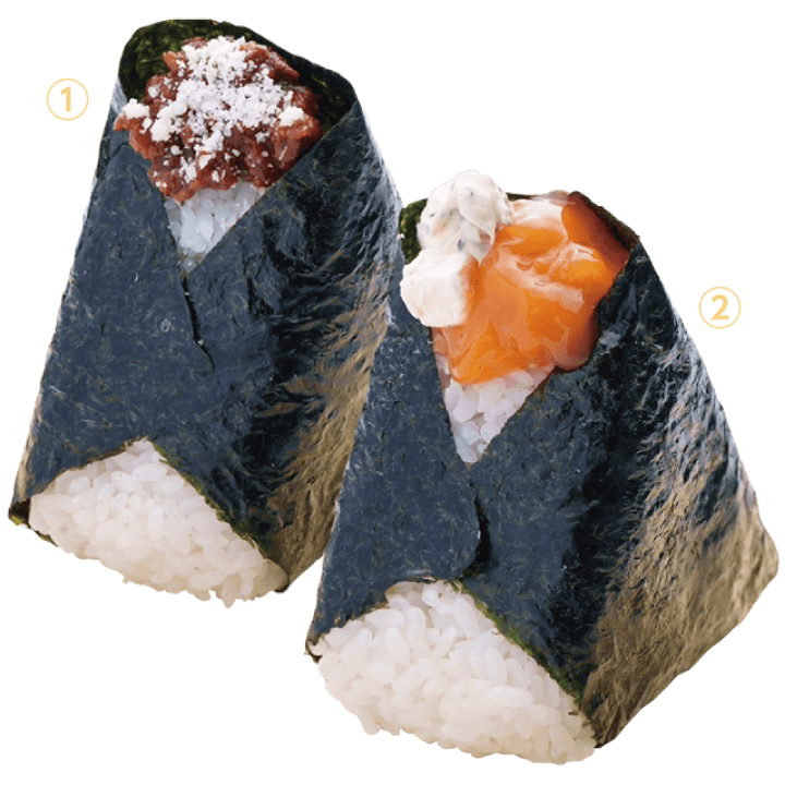 ①濃厚なトマトの旨みとひき肉の食感がたまりません!パルメザンチーズがさらにコクをプラス!②自家製卵黄とチーズのまろやかな調和がクセになる、濃厚な風味の洋風おにぎりです!