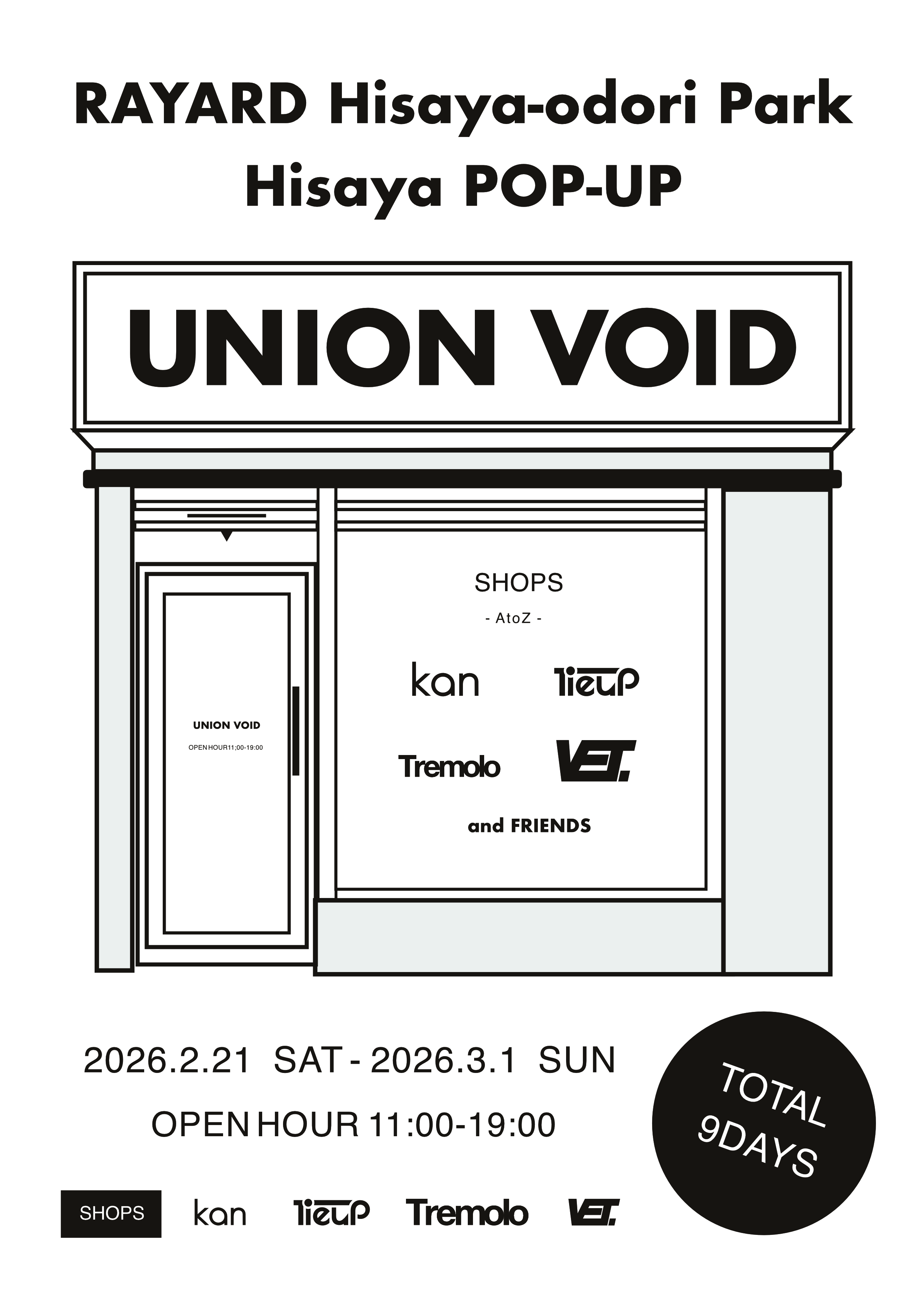 4つのアパレルブランド、セレクトショップが混ざり合い展開するスペース【UNION VOID】を2/21(土)~3/1(日)まで開催いたします。