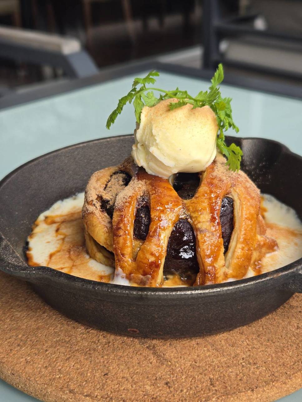 ・熱々と冷たいのハーモニー: スキレットにのせた熱々のアップルパイの上に、はちみつ風味のリコッタチーズクリームと冷たいバニラアイスをトッピング。