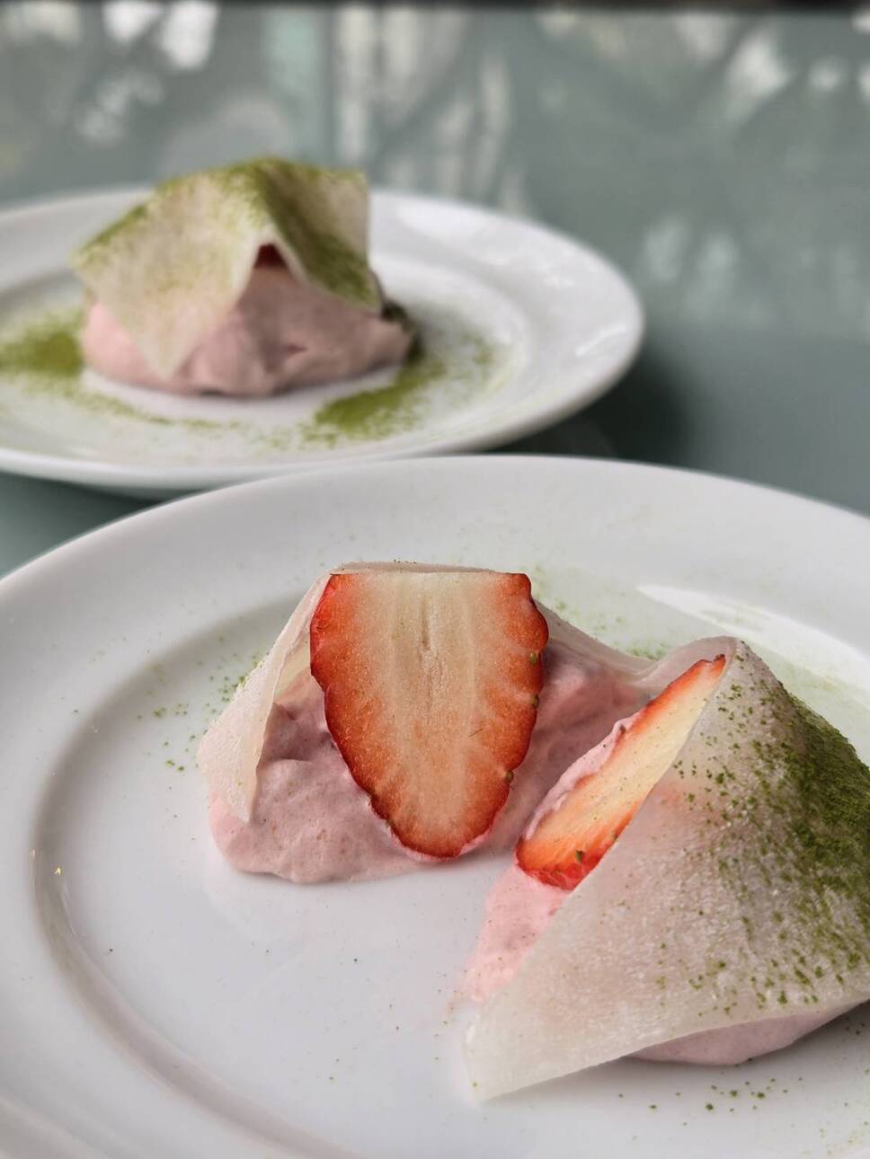 ・いちごムース~大福仕立て~: 甘酸っぱいいちごムースの中に、丸ごと一粒の苺を閉じ込めました。上から求肥(ぎゅうひ)をのせた、もちもち食感の「洋風大福」です。