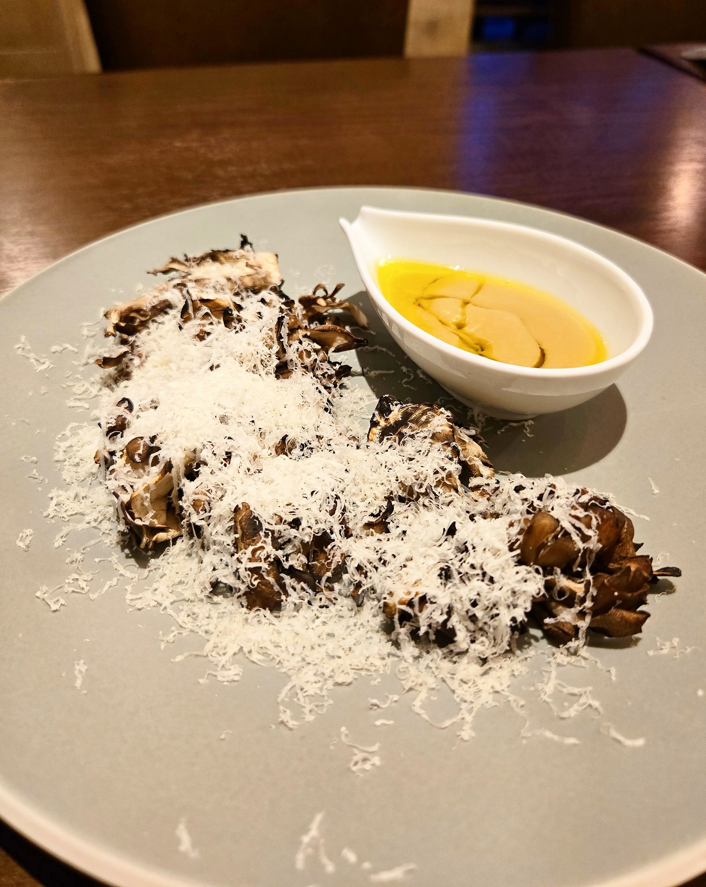 山伏茸、白嶺茸、柿木茸、柳まつたけの4種のきのこを低温調理し、ゴルゴンゾーラチーズと合わせました。