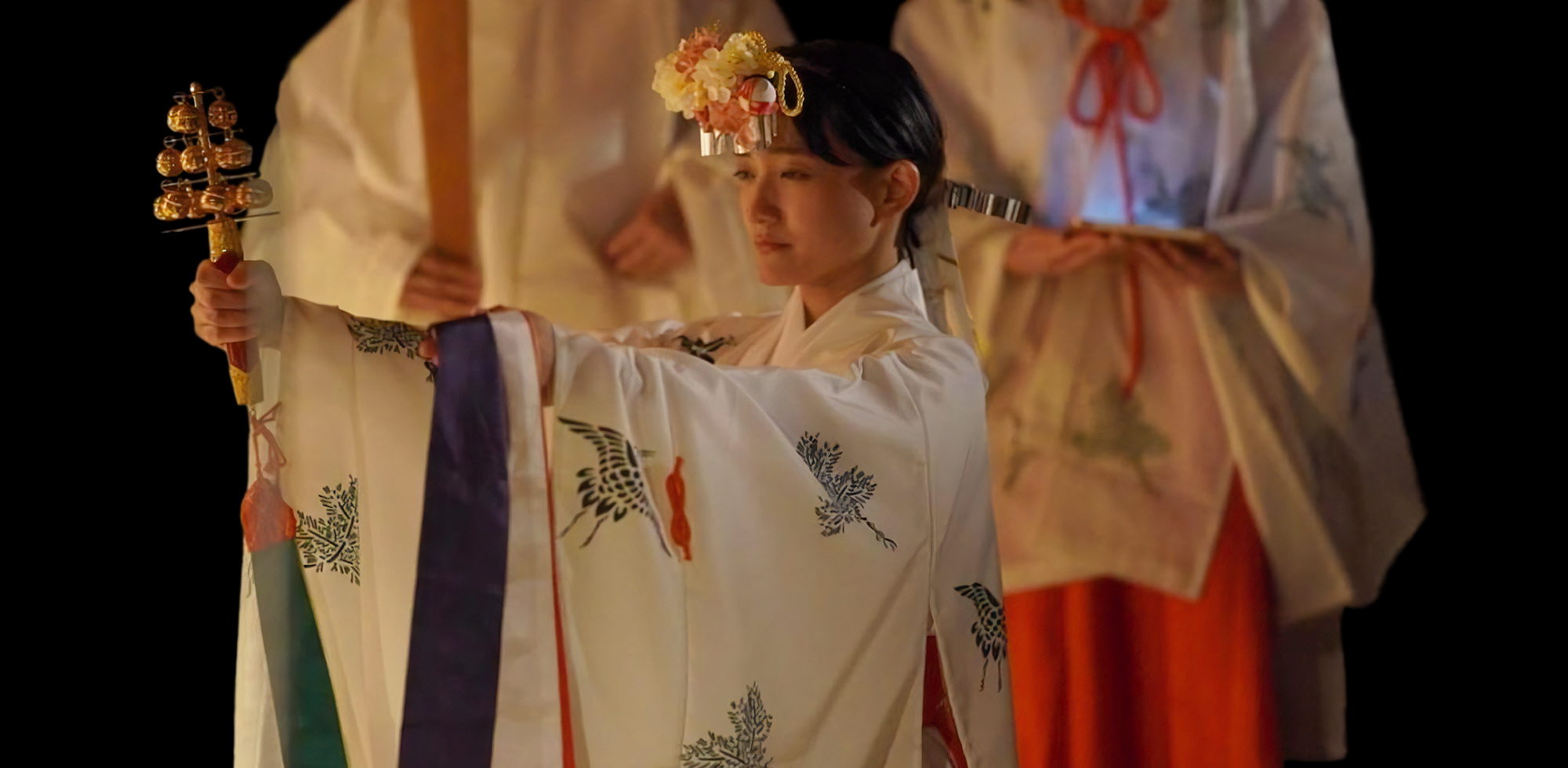 その後の直会 (なおらい) を巫女 (みこ) の舞や、伶人 (れいじん) の雅楽演奏と合わせて、神がかり的な世界観を創造します。