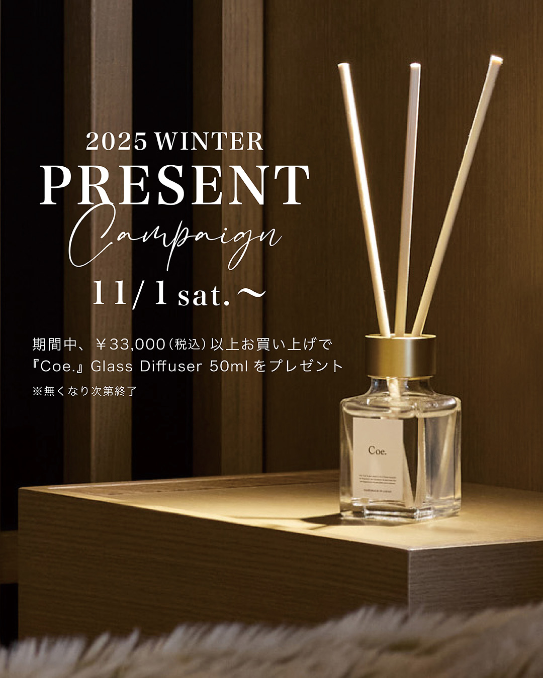¥33,000(税込)以上お買上げのお客様に、調香師が丁寧に作り上げたHAND MADE IN JAPANのフレグランスブランド「Coe.」のグラスデフューザー(50ml)をプレゼントいたします。