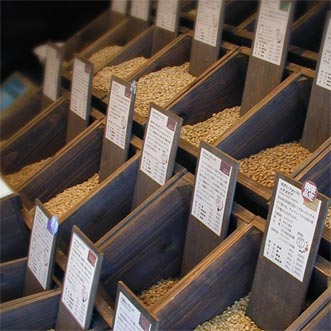 「おいしさ」を基準に買い付けた、こだわりのコーヒー店。店内には、まだ焙煎されていない緑色の豆が約30種。すべて、注文を受けてからその場で焙煎してくれる。新商品や数量限定品、単一農園単一品種の豆など、コーヒー通をうならせる商品も多数。また、煎りたての豆を使って1杯ずつ抽出する香り豊かなコーヒーを店内またはテイクアウトで飲むこともできる。