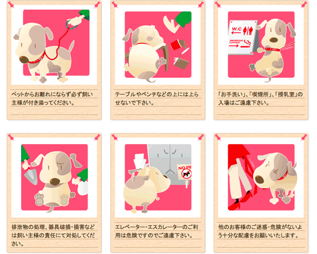 - ・ペット入店可能ショップへの入店の際は、必ずペットゲージに入れて頂くか、抱きかかえてご入店下さい。