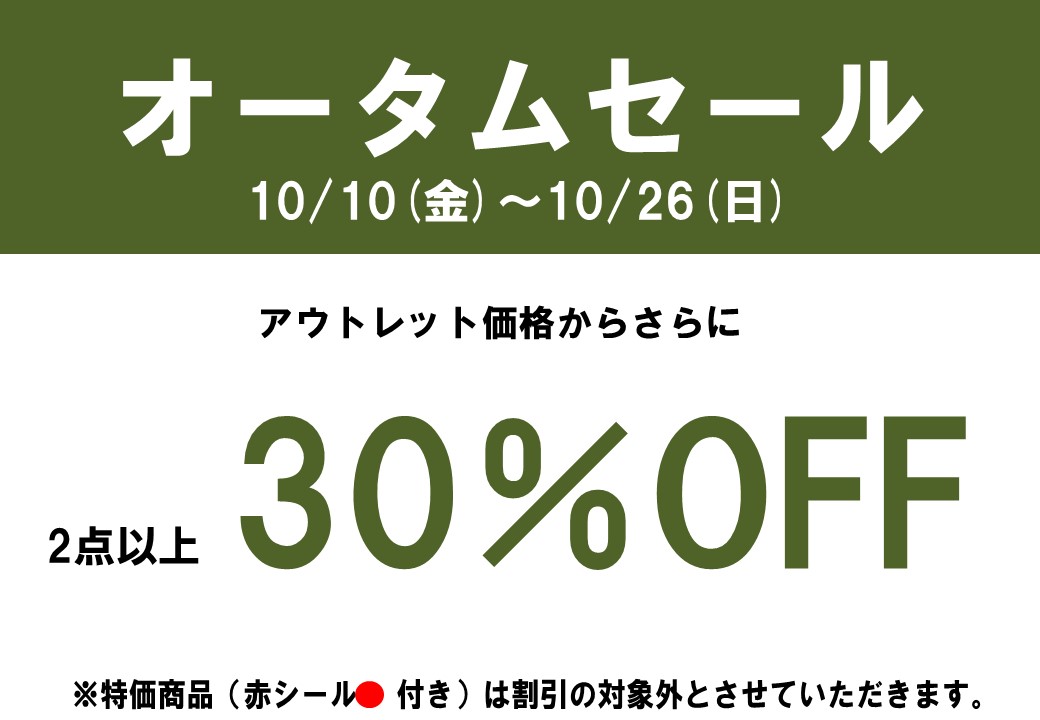 10/10(金)~10/26(日)の期間中、会員登録又は登録をお済のお客様に限り、2点お買い上げで30%OFF!!